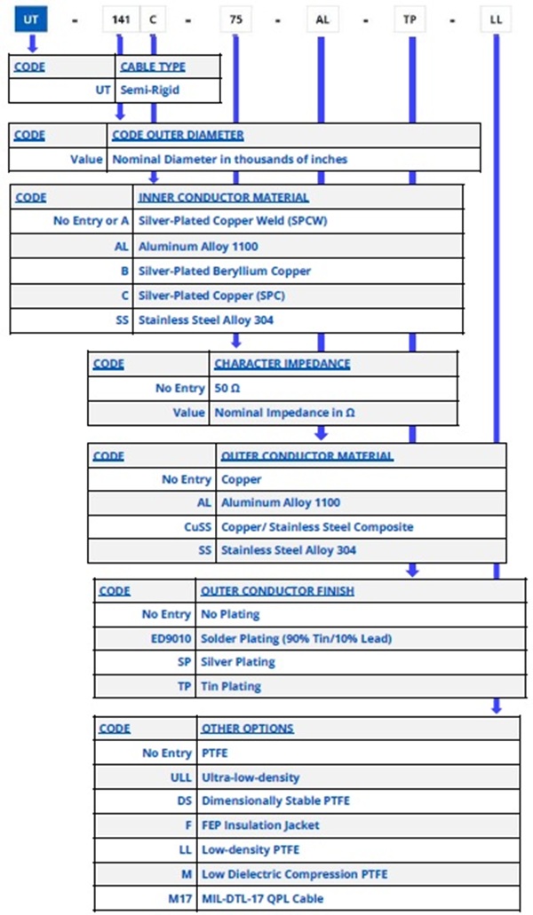 | UTシリーズの品番体系は、特に標準ケーブルにおいて、シンプルかつ短く、非常に分かりやすい構成となっています。構成部品に使用される材料は、各ケーブル仕様の項目内に個別に記載されています。 |