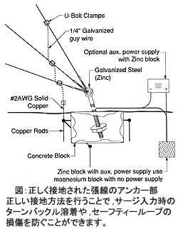 ターンバックルでのアークの発生を完全に防ぎたいときには、アンカープレートと接地ロッドとの間を接続することをお奨めします。空中に張られるリード線には、屈曲部の半径が8インチを超えないようにするためにガイドが必要です。